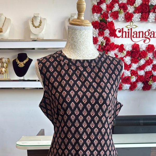 Add a touch of traditional charm to your modern wardrobe with this stylish Ajrakh fabric A-line top. Designed with a trendy halter neck and available in both sleeved and sleeveless options, this top offers versatility and elegance for every occasion.