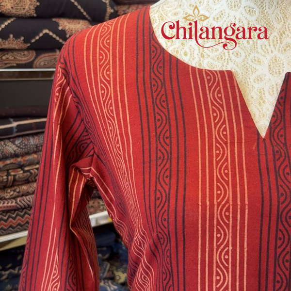 Add a touch of traditional charm to your modern wardrobe with this stylish Ajrakh fabric A-line top. Designed with a trendy halter neck and available in both sleeved and sleeveless options, this top offers versatility and elegance for every occasion.