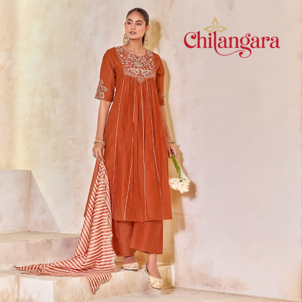 Add a vibrant touch to your ethnic collection with this elegant 3-piece suit set, available in stunning orange and blue color options. The beautifully gathered top features delicate center lace detailing, creating a soft and graceful silhouette.