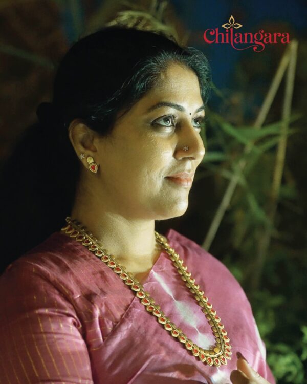 The Finishing Sparkle: Paired with our signature Mango Necklace and delicate, simple mango studs.