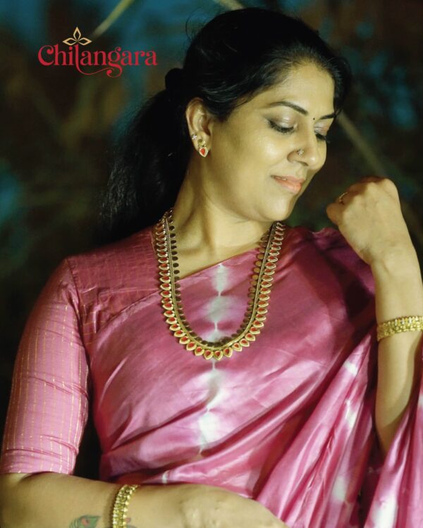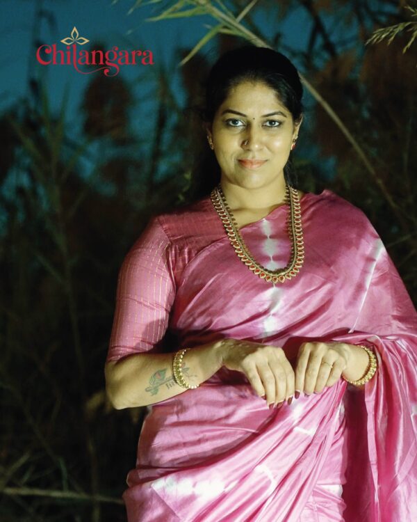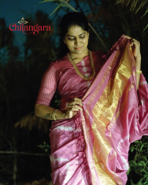 Introducing our stunning Rose Pink Soft Silk Saree, a perfect blend of tradition and contemporary style. This piece features a unique Tie & Dye pattern paired with a classic Gold Zari border, creating a look that is both timeless and trendy.Designed for the modern woman who loves detail The Perfect Fit: A High Princess cut blouse with chic elbow-length sleeves, Pallu end tassels attach