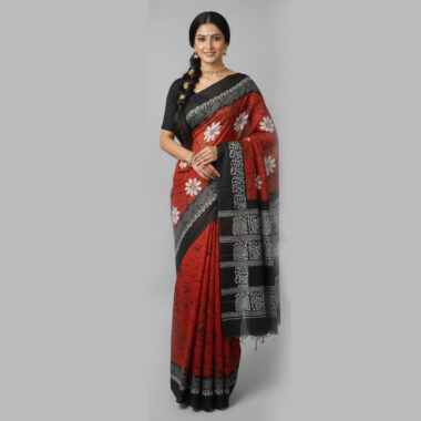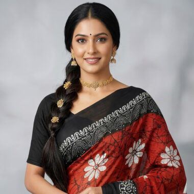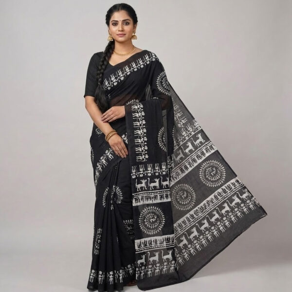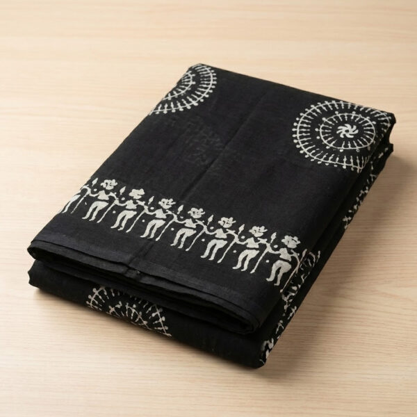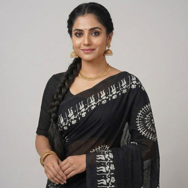 Be the first to review “Teal and Black Batik Print Mul Silk Saree with Hand-Block Border” Cancel reply