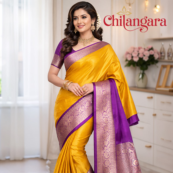 Step into elegance with our yellow and purple silk saree, designed for women who cherish traditional beauty. The zari work on the borders and pallu adds a luxurious touch, making it ideal for weddings, festivals, and special events.